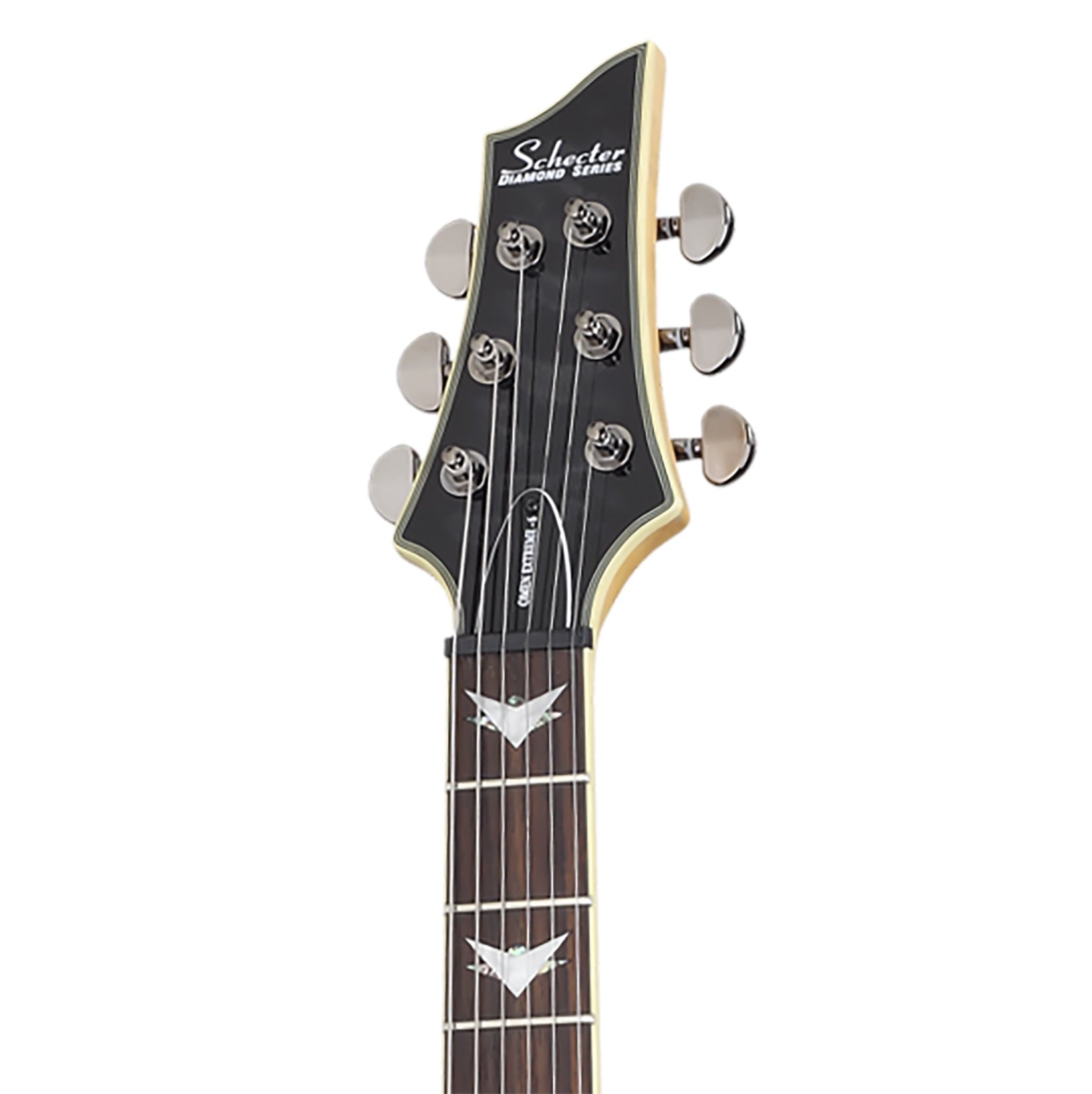 Guitarra eléctrica, cuerpo de caoba, tapa arqueada de maple acolchado, brazo C delgado de maple, diapasón de palo de rosa, incrustaciones de vector de abalone y pearloid, escala: 25.5” (648 mm), 24 trastes x-jumbo, cejuela Graph Tech XL Black Tusq de 1.653” (42 mm) de ancho, alma ajustable de 2 vías con tuerca Allen 5/32” (4 mm), pastilla del puente: Schecter Diamond Plus, pastilla del brazo: Schecter Diamond Plus, dos volúmenes, un tono (push/pull) y selector de 3 posiciones, hardware en cromo negro, puente Tune-O-Matic con string thru body, maquinaria Schecter, perillas de metal moleteado con tornillo de ajuste, construcción: bolt-on.